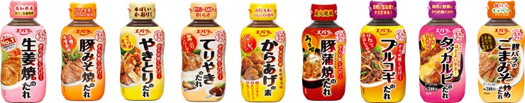 (「生姜焼のたれ」「豚みそ焼のたれ」「やきとりのたれ」「てりやきのたれ」「からあげの素」「豚蒲焼のたれ」「プルコギのたれ」「タッカルビのたれ」「豚バラのごまみそ炒めのたれ」)