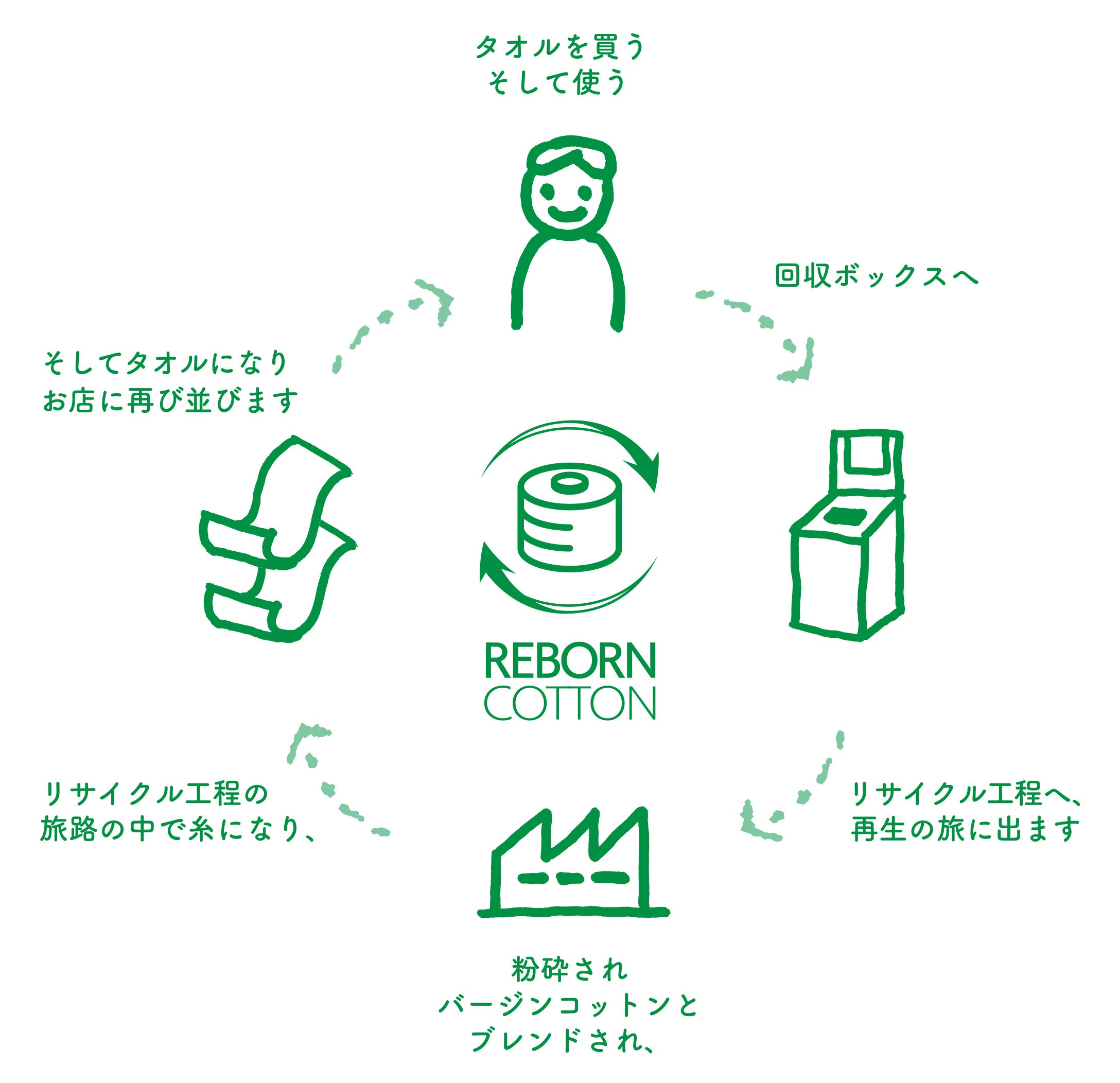 ・『REBORN COTTON』はタオルの緯糸(よこいと)として使用し製品化される。この再生糸を使用した「生まれ変わるタオル」には『REBORN COTTON 』ロゴの下げ札が付けられる