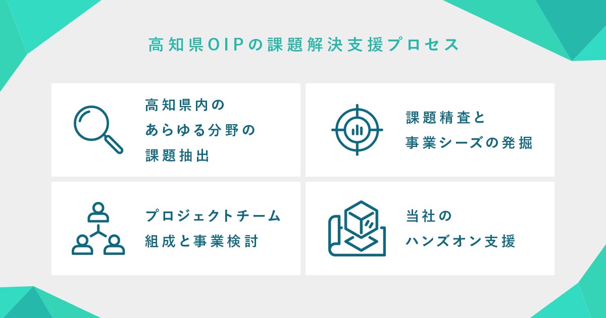 課題を抱える県内事業者様からビジネスにつながる課題を抽出し、県内外問わず課題解決に役立つデジタル技術を持つ事業者様に「高知県IoT推進ラボ」に会員としてご登録いただき、以下のプロセスで製品開発等を目指すプロジェクトを組成して、高知県・当社が伴走しながら製品・サービス化を実現します。