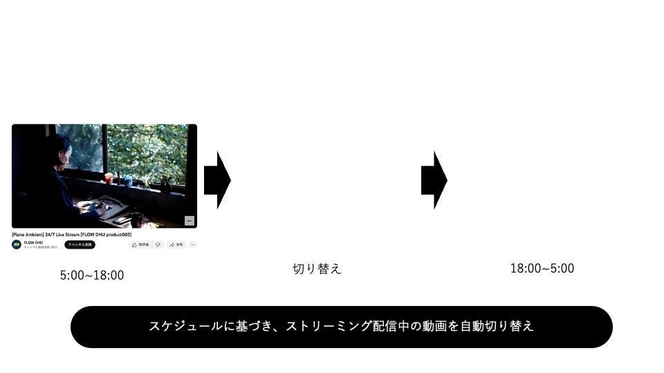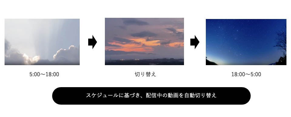 スケジュールに基づき、動画を自動的に切り替えます。さらに動画の切り替え時には、切り替え用動画などの特別なコンテンツを流すことができます。昼と夜で異なるコンテンツを提供するなど、視聴者の興味を引き続けることができ、視聴者に合わせたカスタマイズが可能です。