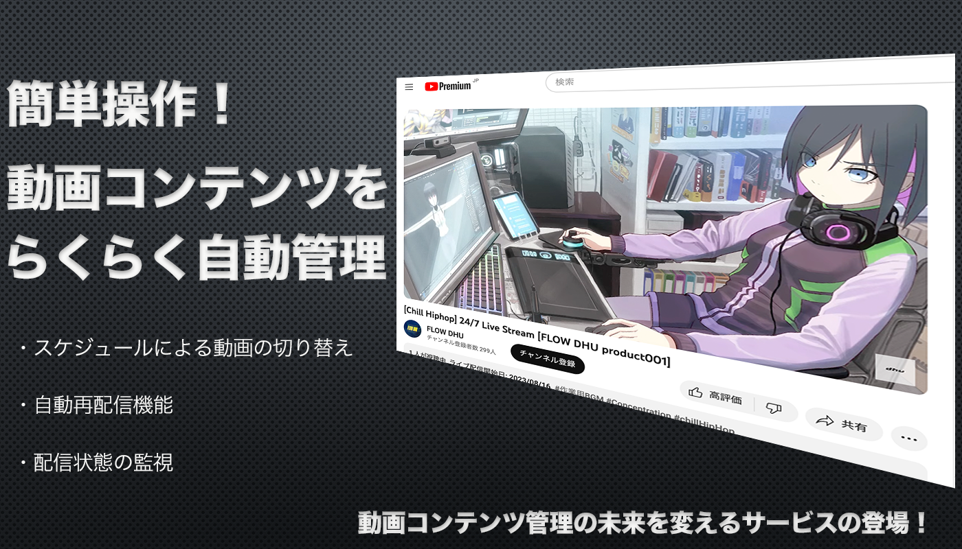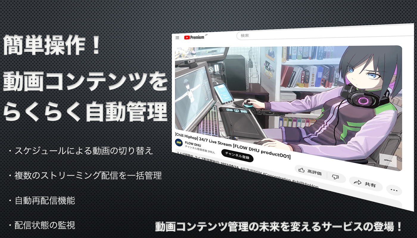 ストリーミング配信管理システムでは、動画コンテンツの効果的な管理とカスタマイズを実現します。スケジュールに基づく動画の切り替えやストリーミング配信の24時間自動管理、再配信のシームレスな制御を提供します。ミュージックラジオやニュース番組、チルタイム動画など、24時間ストリーミング配信を行っている方々に最適なサービスです。このシステムは今後のデジタルメディア分野において不可欠なツールであり、効果的なコンテンツ管理とカスタマイズを提供することが可能となりました。