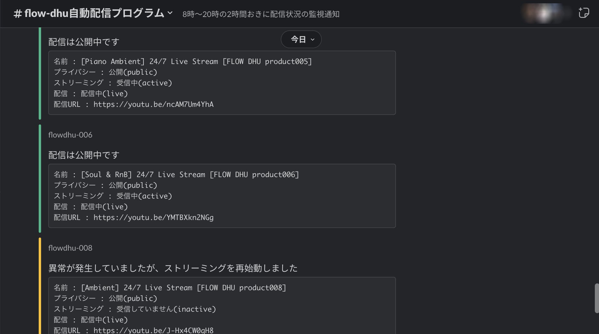 24時間体制で配信状態を監視し、日中2時間おきに配信状態のSlack通知を行います。
