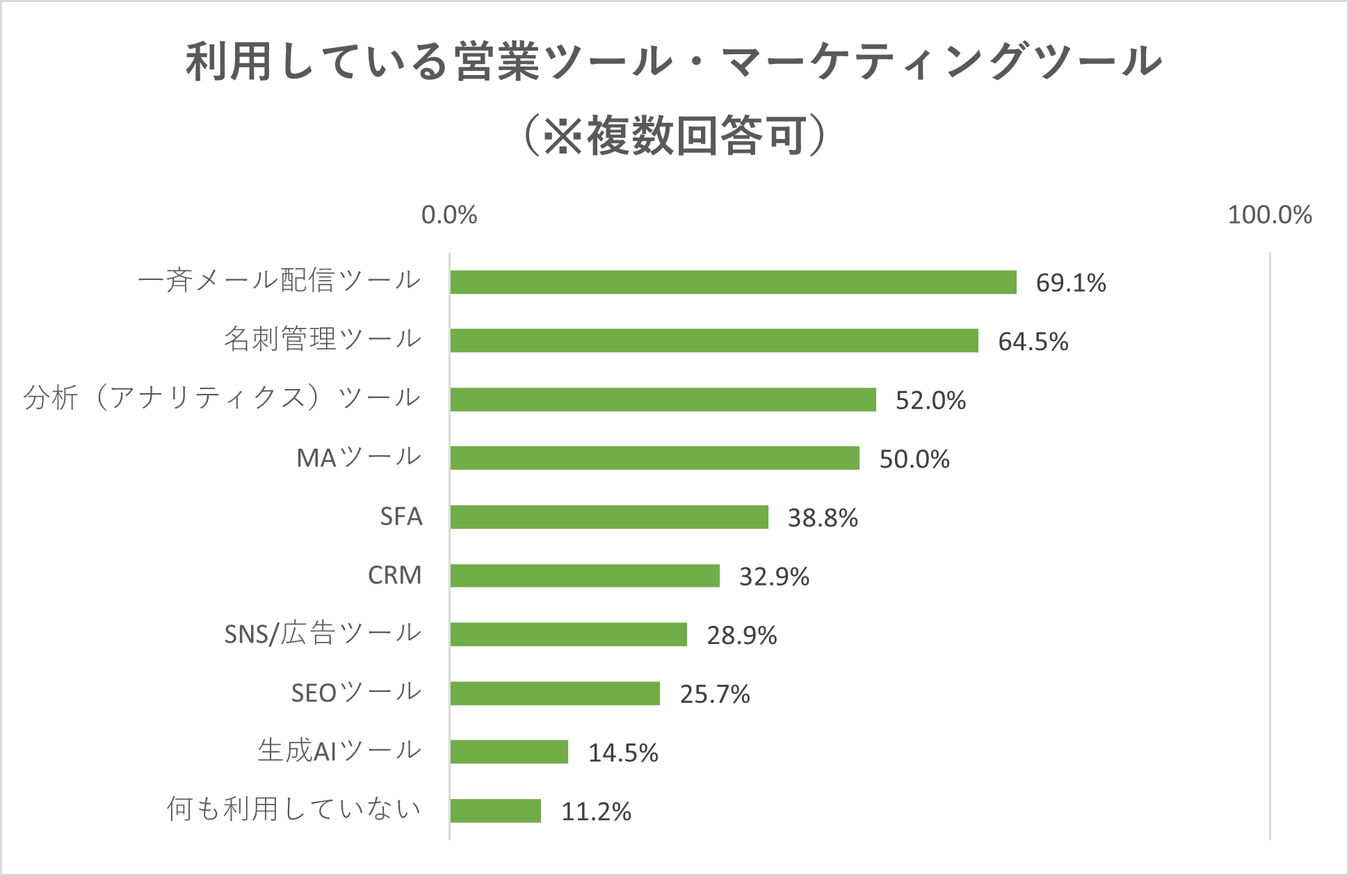 今回調査にご協力いただいた152社のうち、いずれのツールも利用していない企業は11.2%に留まり、約9割の企業ではなんらかの営業ツール・マーケティングツールを利用しているということがわかりました。