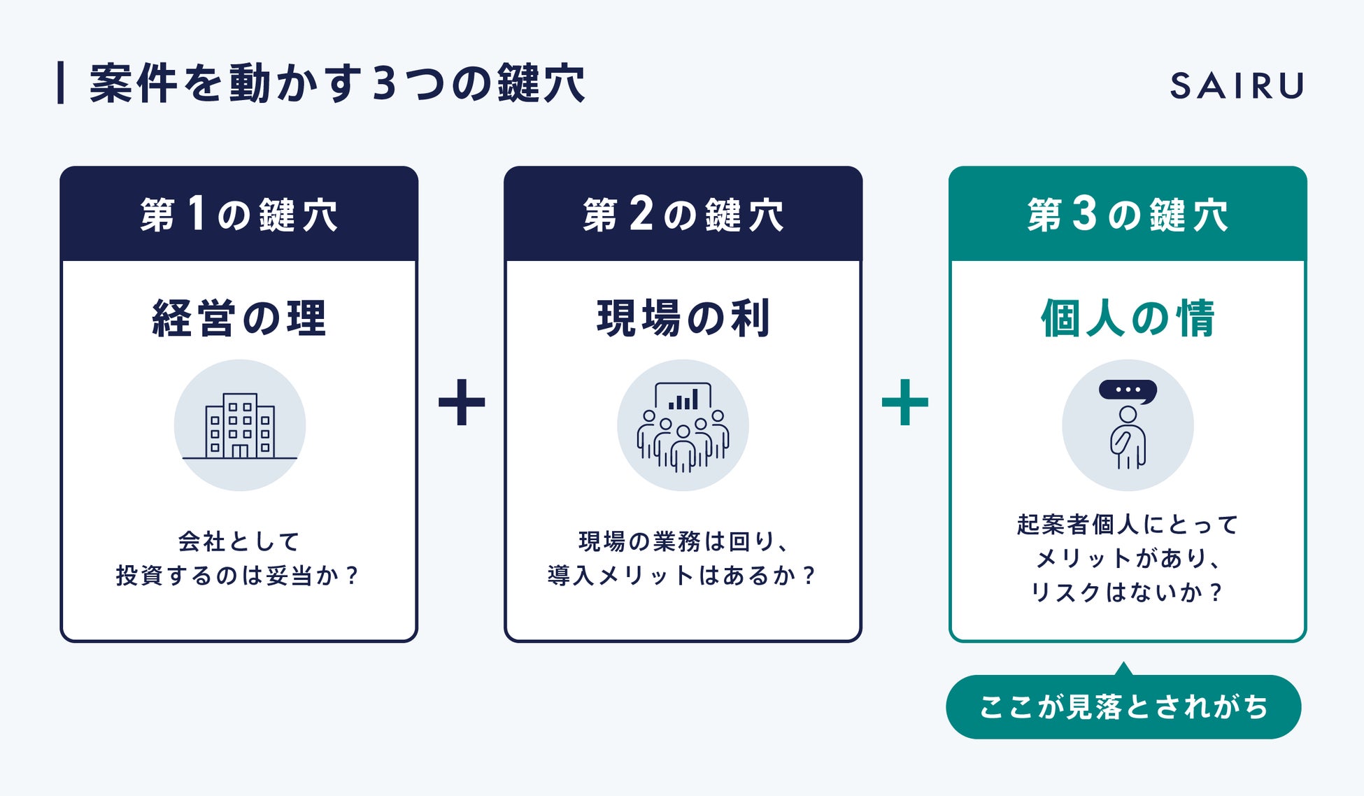 案件を動かすには、「経営の理(経営層が求める合理性)」「現場の利(現場担当者にとっての実利)」「個人の情(起案者の感情)」という3つの鍵穴に合う鍵を差し込む必要があります。なかでも「個人の情」は見落とされがちです。しかし、起案者個人が「起案するメリットがない」「失敗のリスクが高い」と感じれば、案件は動きません。