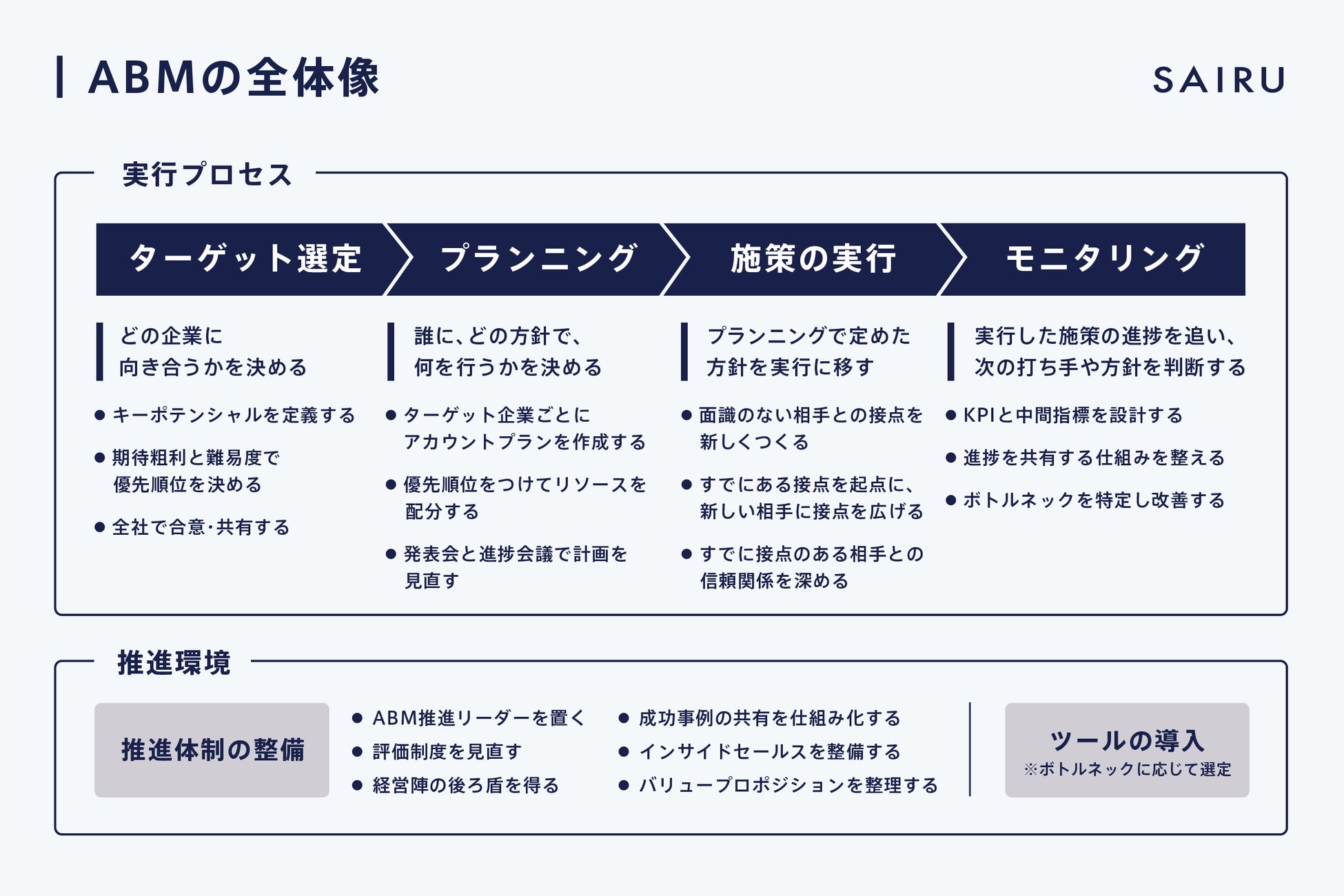 本書では、ABMの進め方を「実行プロセス」と「推進環境」に分けて整理しました。実行プロセスは「ターゲット選定→プランニング→施策→モニタリング」の4ステップ。推進環境は「体制」と「ツール」で構成されます。全体像を把握することで、目指すべき方向と自社に足りない要素が明確になります。