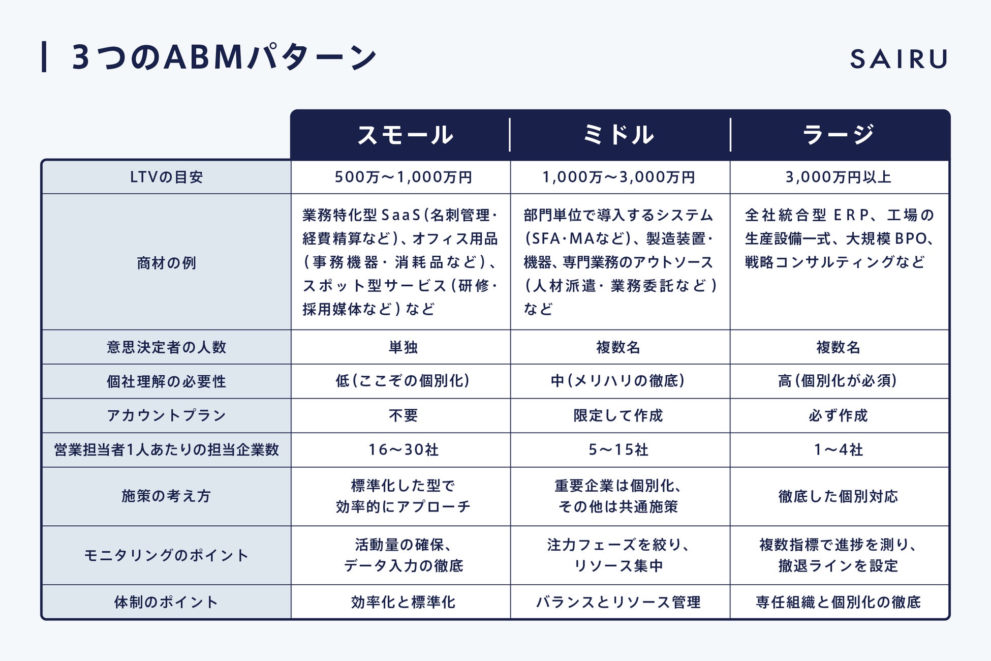 本書では、ABMを「ラージ」「ミドル」「スモール」の3つのパターンに整理しました。LTVの大きさと、ターゲット企業の意思決定の複雑性の2軸による分類です。