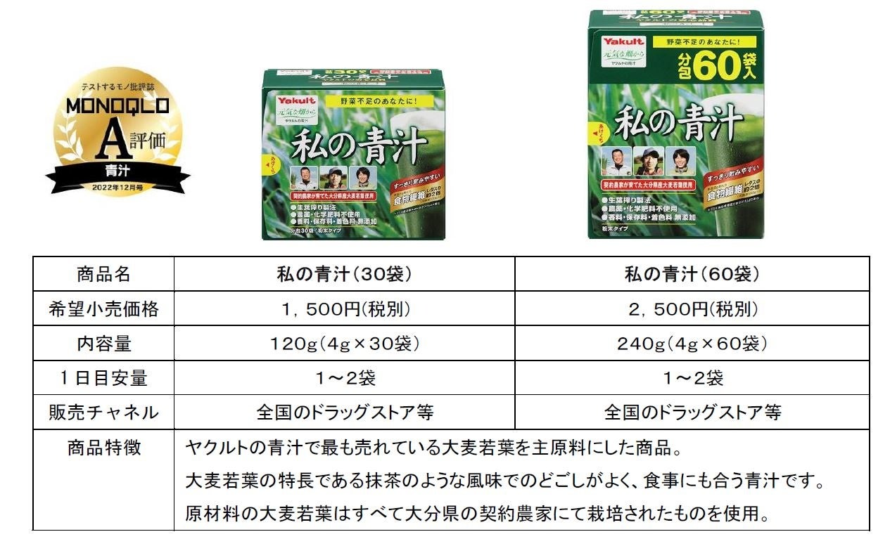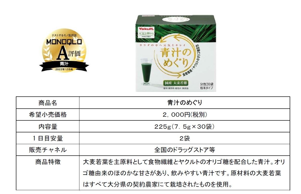 ヤクルトヘルスフーズ株式会社(大分県豊後高田市/代表取締役社長 蝦名 秀昭)が販売する青汁3商品が晋遊舎の発行する雑誌「MONOQLO」(2022年12月号/2023年1月号)にて高評価を受け、「ヤクルトの国産ケール青汁」はベストバイ・オブ・ザ・イヤーを受賞(2023年1月号)、「私の青汁」および「青汁のめぐり」がA評価を獲得しました(2022年12月号)。