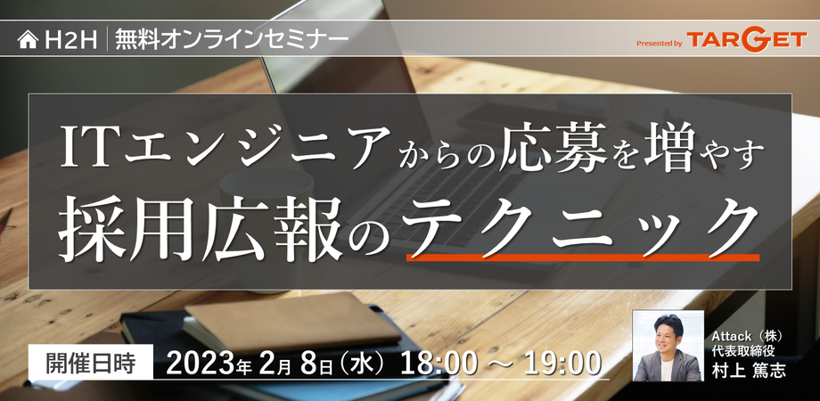 採用支援サービス『TARGET』などを展開するAttack株式会社(本社:東京都品川区、代表取締役:村上篤志)が経営者や採用責任者の方を対象とし、ITエンジニア採用における採用広報に焦点を当てた無料オンラインセミナーを2023年2月8日(水)に開催致します。