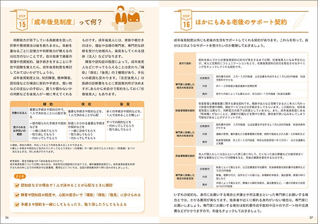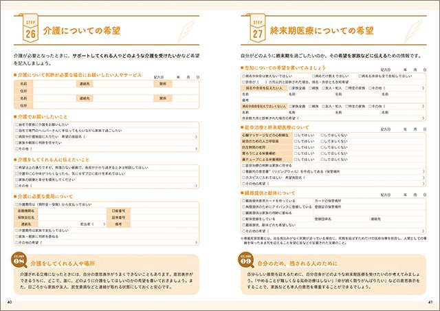 本書でお金や医療、介護などに関連する情報を得ながら、自分のこととして記入していくことで、気持ちや資産を整理することができ、また、不安や問題点が見えてくることで、これからどのように生きていきたいか、資産をどのように整理するべきかなどを考えて行動できるようになります。