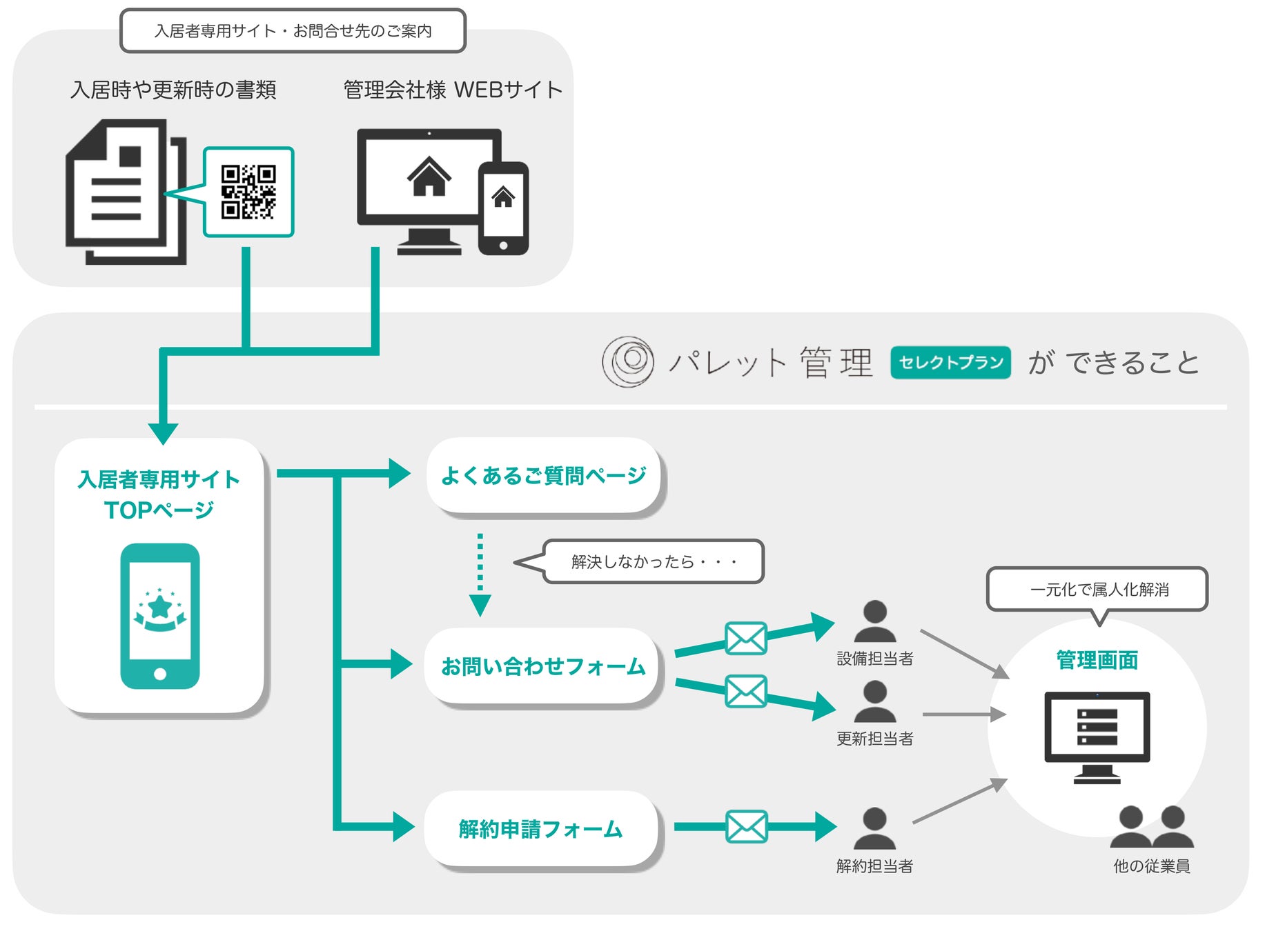 また「パレット管理 セレクトプラン(※2)」は、「パレット管理」から必要な機能だけを選んで簡単に低価格で導入利用できる、入居者専用サイト制作ツールです。