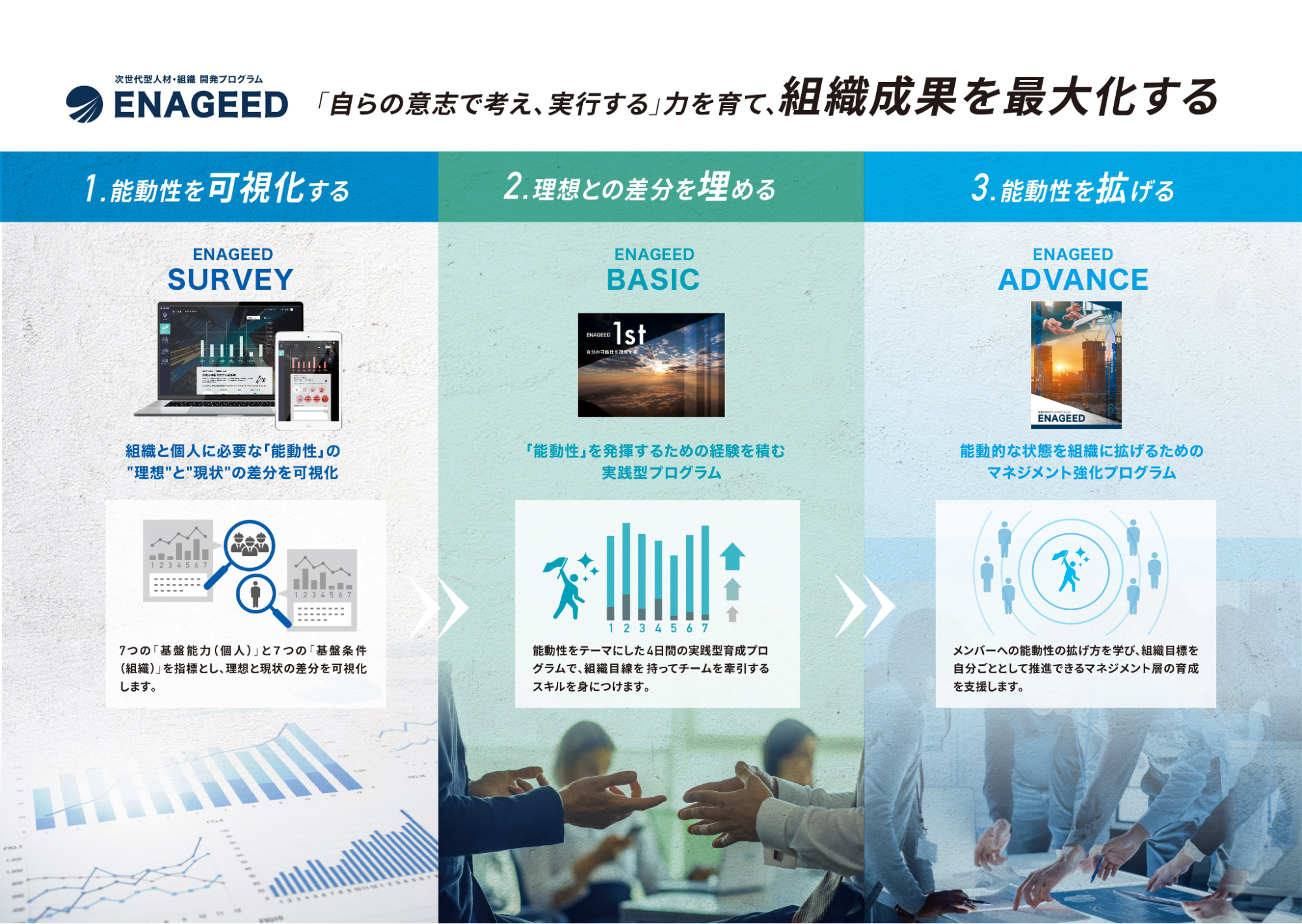 ENAGEED SURVEYは単体でもご導入可能ですが、以下のように弊社研修サービスと併用頂くことで相乗効果を発揮し、さらに組織成果の最大化をサポートいたします。