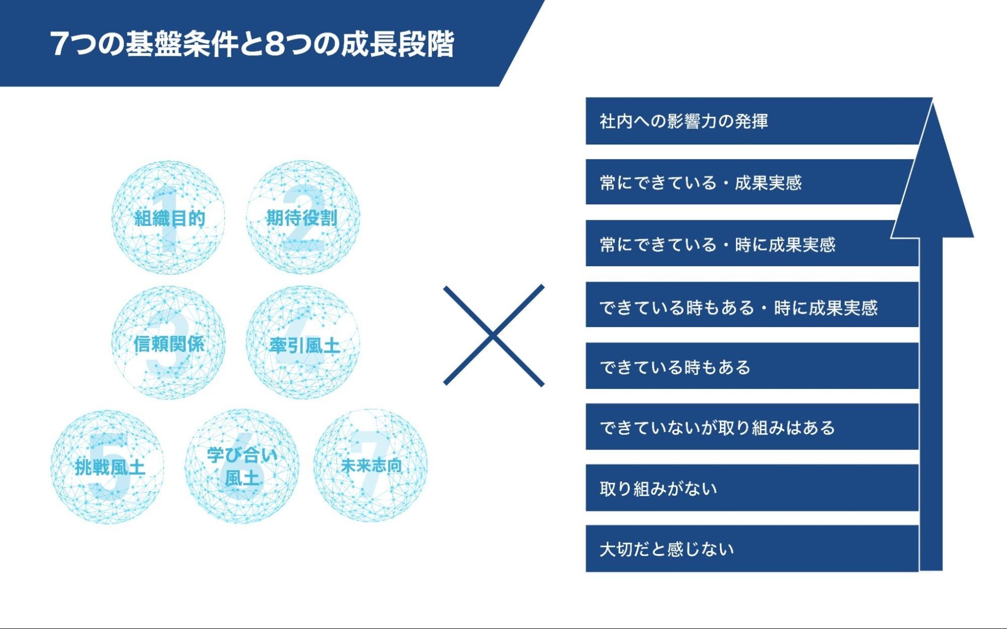 ・組織については、7つの「基盤条件」を指標とし、8つの成長段階を可視化します。