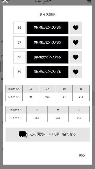ファッションを取り扱うオンラインショップの場合、カラーやサイズのバリエーションが豊富で商品ページのスペースを大きく支配しがちです。当オンラインショップでは、ユーザビリティを高めるためにサイズ選択をモーダルウィンドウで表現しました。商品情報エリアを独占せず、必要な時にサイズごとの買い物かごボタンやお気に入りボタンを選択できるようなアパレルならではのデザインを工夫しました。