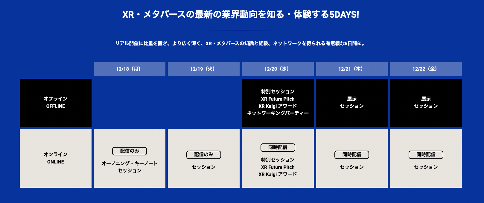 国内外のトップランナーがXR・メタバースに関する最先端の知見を共有します。録画配信に加え、リアルタイム配信、観客を入れた現地セッションなど、計60以上のセッションが行われます。