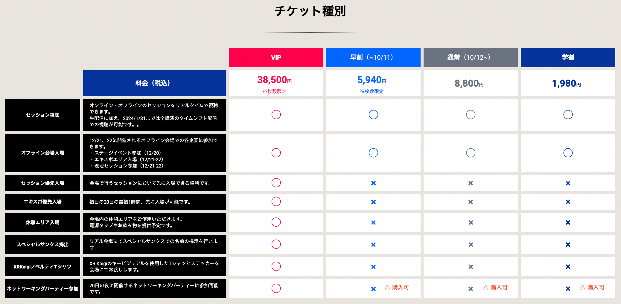 VIPチケットと早割チケット、ネットワーキングパーティー参加券は枚数限定でのご提供ですので、売り切れ次第販売を終了いたします。