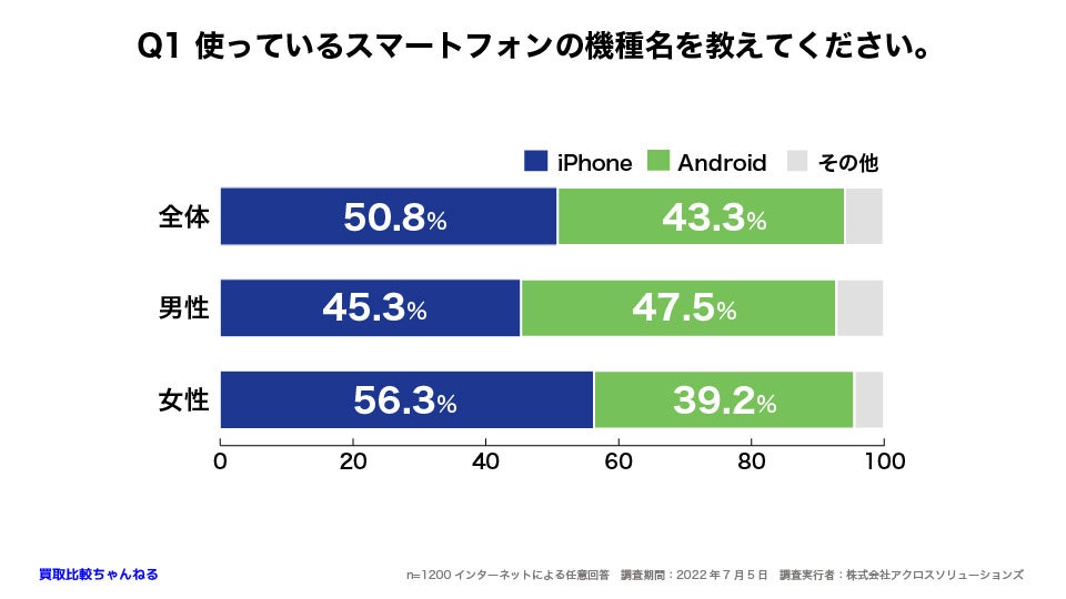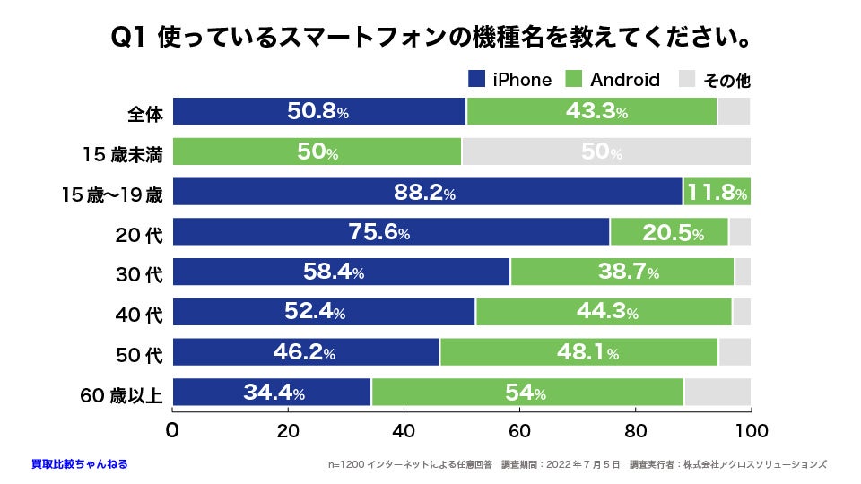 そこで、株式会社アクロスソリューションズと株式会社浜屋が共同運営している買取比較ちゃんねる(URL:https://www.hamaya-corp.co.jp/media )は、10代以上の男女1200人を対象に「スマートフォンに関する意識調査」を実施しました。