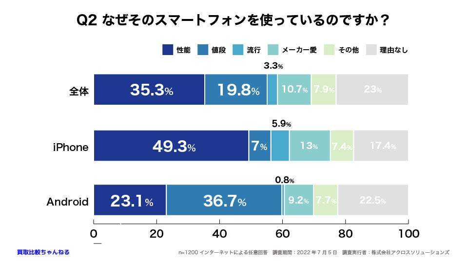 全体の結果では「性能」を判断基準に選んでいる人が35.5%で最も多く、次に「理由なし」が23%、「値段」で選んだという人が19.8%という結果でした。