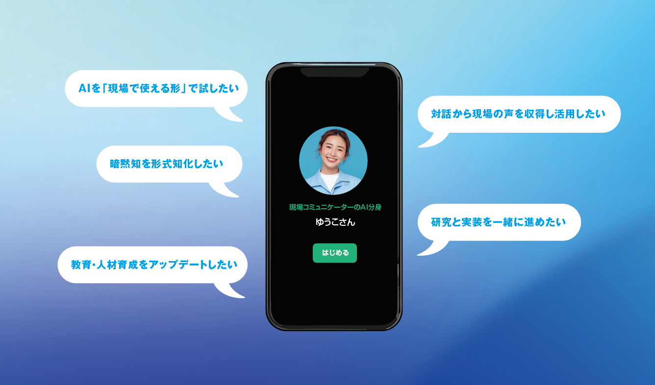 話し方や思考、価値観を学習した“もうひとりの自分”が、対話とフィードバックを通じて、自己理解と成長を促します。AIは人を置き換える存在ではなく、「問いを深め、対話を育てる存在」 になる未来像を、実際のデモを通じて体験いただけます。