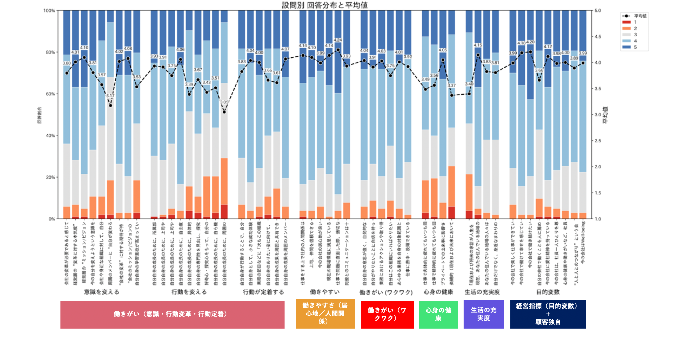 企業の文化や背景が異なれば、ウェルビーイングの正解も異なります。本サービスは設問のカスタマイズに対応しており、既存のアンケート内容は変えずに、回答体験だけを刷新することも可能です。 現場の実態に即した「貴社らしい問い」は、従業員の当事者意識(自分事化)を高め、表面的な回答ではない「深い本音」を引き出します。