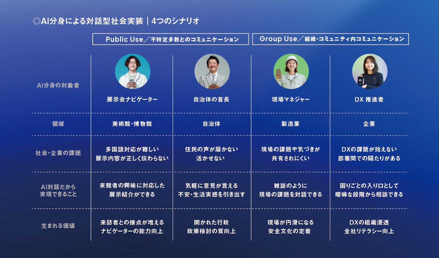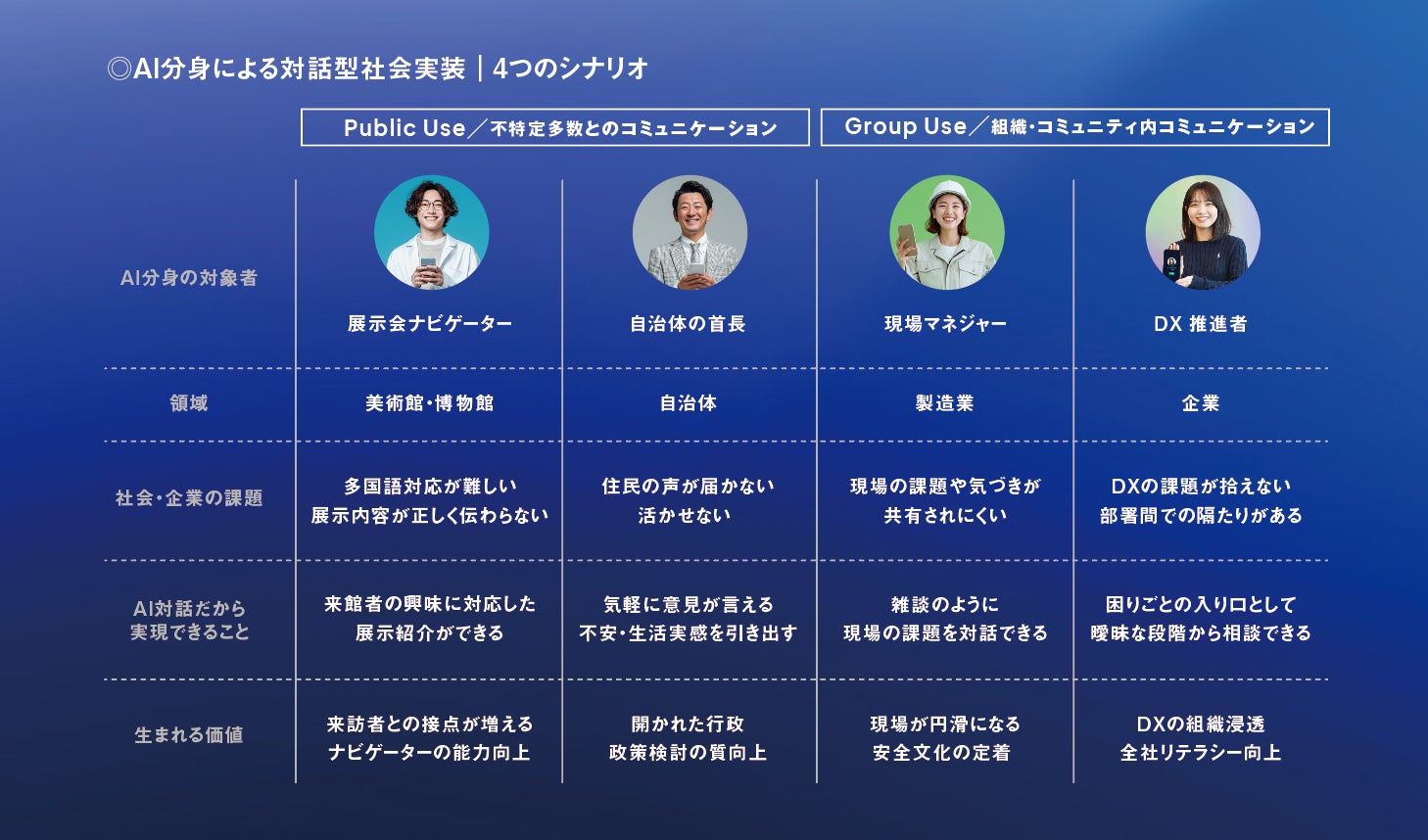 ※「AI分身」は、株式会社ソニーコンピュータサイエンス研究所 笠原 俊一リサーチャーのCybernetic Humanity/CXC(Circular AI Clone) Platform研究の一環として、 日本科学未来館の実証実験公募プログラムにおける「AI分身科学コミュニケーター」の実証実験成果を活用しています。