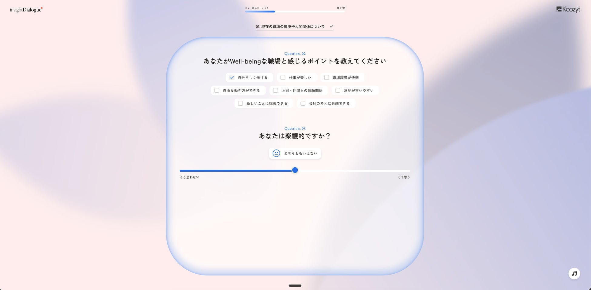 今の気分に合わせて色や音楽を選び、回答環境を最適化することで、心を落ち着け楽しみながら回答を始めることができます。 その日の気持ちに寄り添い、微妙な気持ちを体現するためのレベルバーの実装など、「アンケートは無機質なもの」という常識を覆し、体験そのものをウェルビーイングな時間へと変えます。