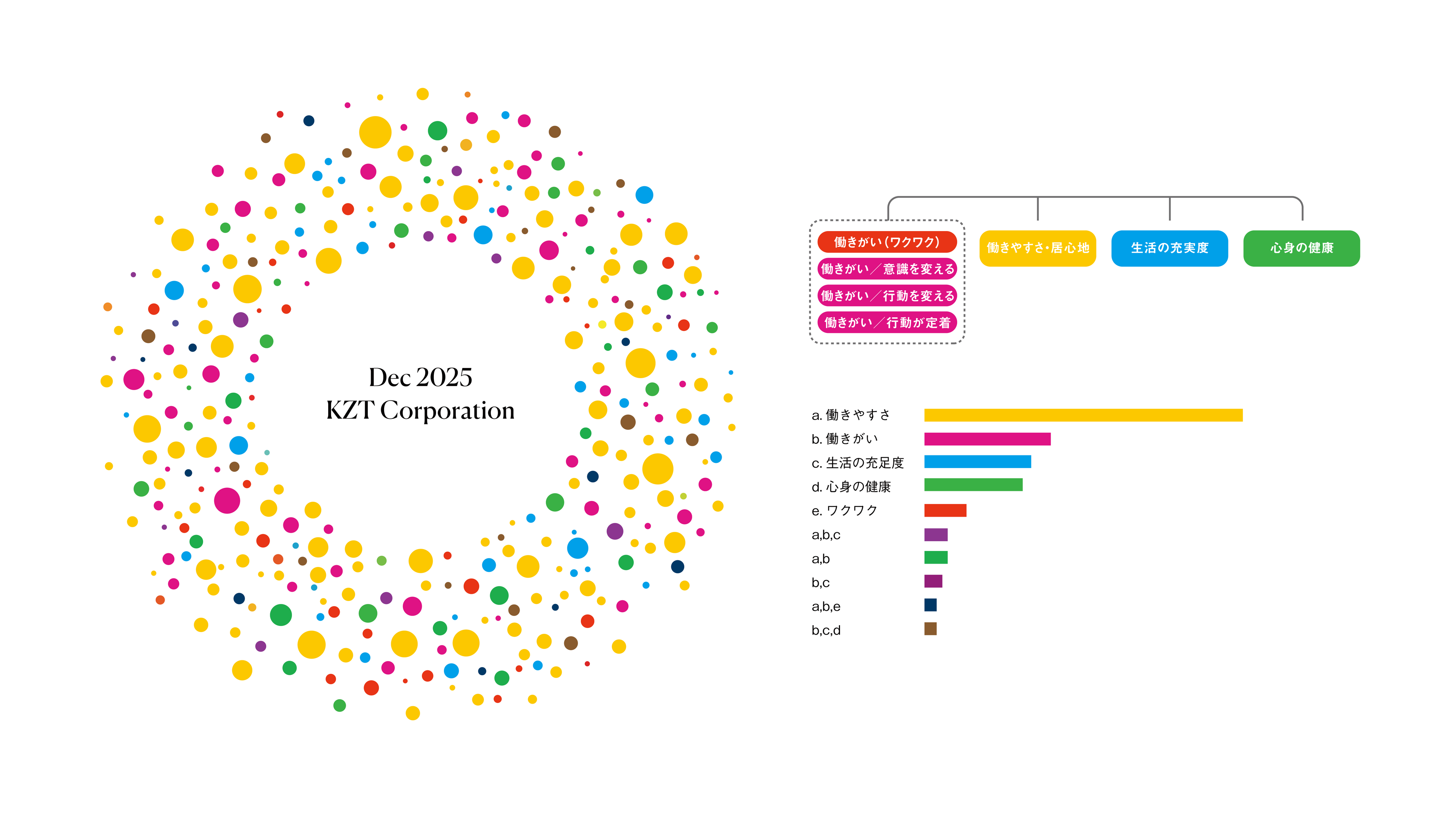 単にスコアを測るだけでなく、組織が動くための「メカニズム」を解明。因果分析CALC※により「信頼関係がどう創造性に繋がっているか」といったWell-beingの構造を特定し、その分析結果をもとに現場での対話を促す診断結果を提供。Well-beingな組織の状態を「Well-beingブーケ」として色で表現しています。