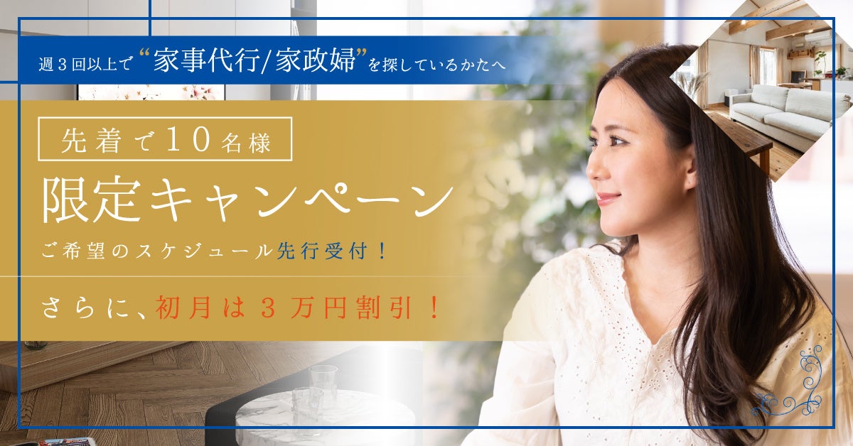 家事代行を週3回以上のスケジュールで定期利用ご希望の方から「先着10名様」を対象に、ご希望のスケジュールにて先行受付いたします。さらに初月ご請求額から3万円を割引いたします。