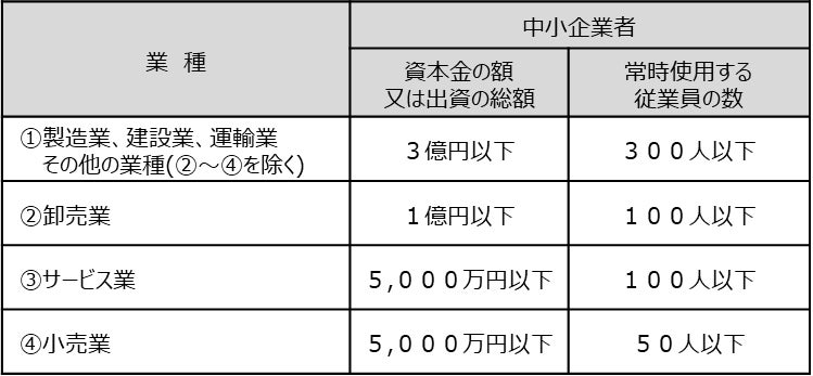 中小企業基本法では業種により「中小企業者の範囲」を下記のとおり規定しています。