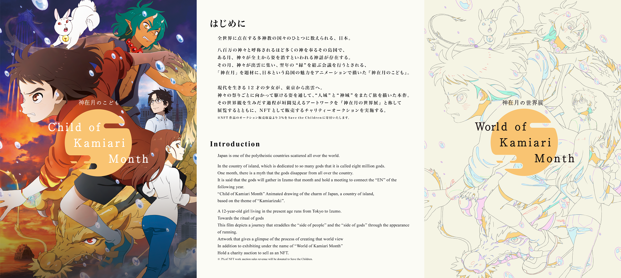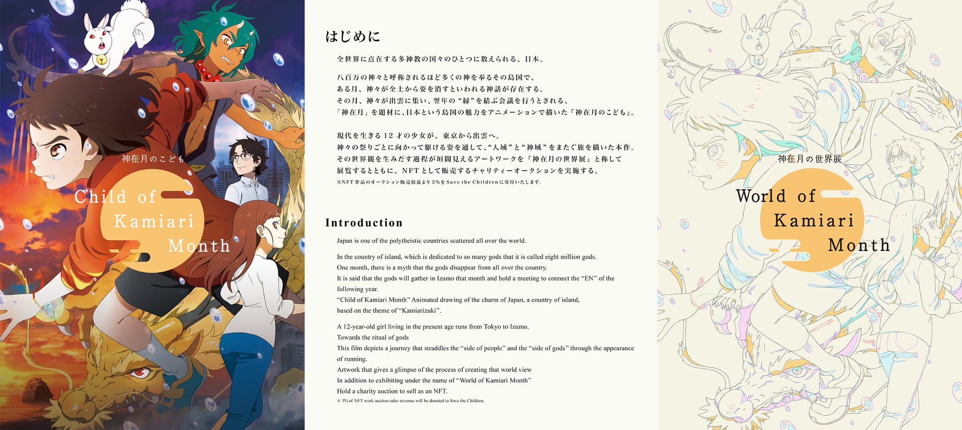 “この島国の魅力をアニメーションで翻訳して世界へ”。その想いに日本を代表する制作陣&出演陣が共鳴して生み出された映画『神在月のこども』。2021年10月に全国約200館で公開され、同月には、「モントリオール国際リース賞映画祭2021」で最優秀監督賞など主要5部⾨にノミネート。また、翌2022年2⽉には、動画配信サービス「Netflix」を通じて全世界に配信を開始。1週間で約266万時間(161万⼈鑑賞相当)の視聴時間を記録して、同サイトのその週の「Global Top10(他⾔語)」で8位に輝いた。世界でのその反響のもと、今月7月1日より、米国ロサンゼルス「Anime Expo」、7月14日より、仏国パリ「Japan Expo」への招待による凱旋登壇・凱旋上映が決定し、その披露にあわせ、この度、「神在月の世界展」on Cyberを開催する運びとなった。東京から出雲へ。神域をまたぎ、神話の地へ馳せた主人公・カンナのものがたりが広く世界を駆けている。