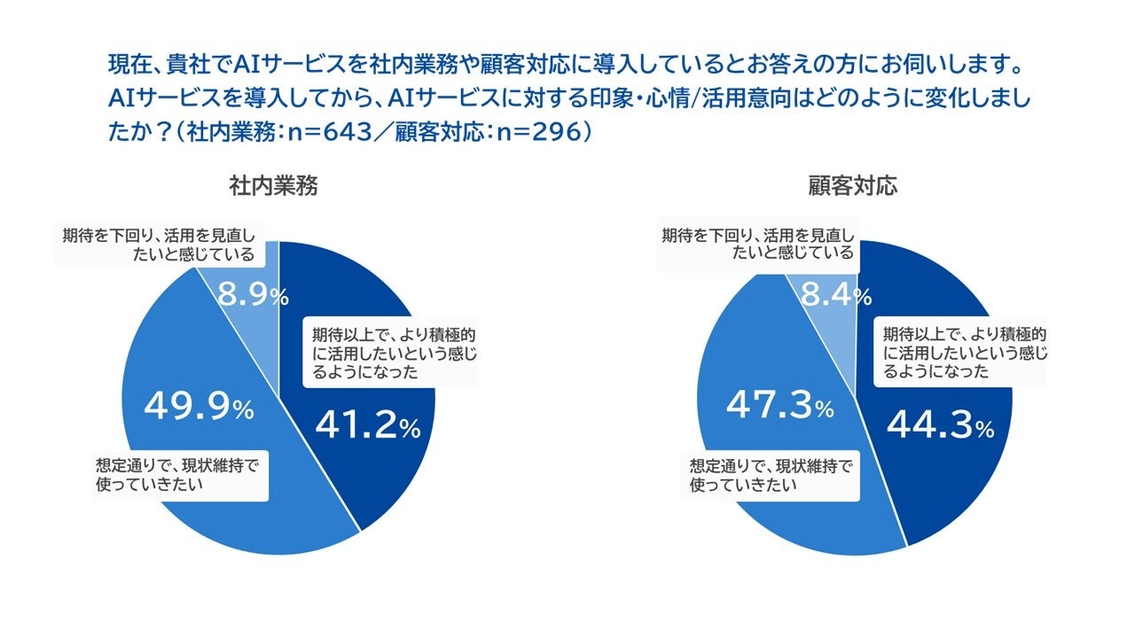 また、AIサービスを社内業務、顧客対応で導入している企業それぞれに対して、導入後の印象の変化を尋ねたところ、「期待以上で、より積極的に活用したいと感じるようになった」(社内業務:41.2%、顧客対応:44.3%)、「想定通りで、現状維持で使っていきたい」(社内業務:49.9%、顧客対応:47.3%)という結果でした。社内業務だけでなく顧客対応においても、ともに9割以上がAIサービスの導入に満足し、より積極的な活用や今後も活用の継続を望んでいることが明らかになりました。