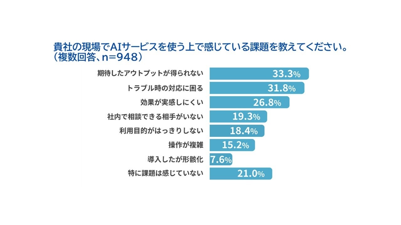 AIサービス活用に約8割が課題を抱える。課題として、「期待したアウトプットが得られない」(33.3%)、「トラブル時の対応に困る」(31.8%)、「効果が実感しにくい」(26.8%)などがあがる。