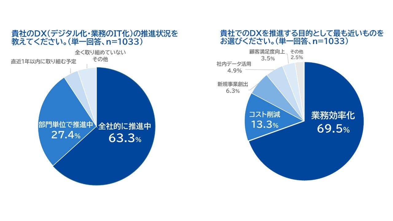 DXを推進している企業は全体の9割以上、約7割が業務効率化を目的にあげる