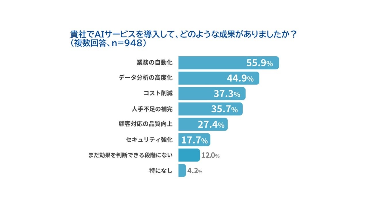 AIサービス導入後の成果について尋ねたところ、55.9%は「業務の自動化」と回答し、次いで「データ分析の高度化」(44.9%)、「コスト削減」(37.3%)などに成果を実感していることがわかりました。