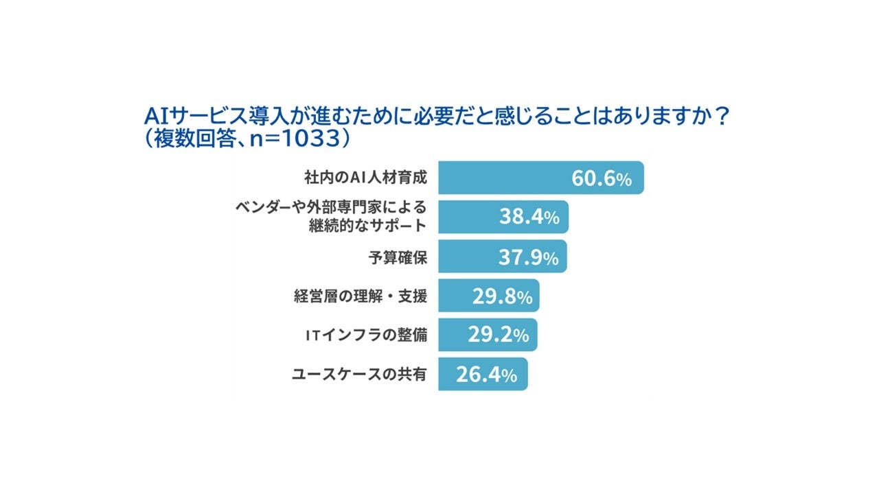 AIサービス導入が進むためには約6割が「社内のAI人材育成」が必要と回答。「ベンダーや外部専門家によるサポート」(38.4%)、「予算確保」(37.9%)、「経営層の理解」(29.8%)、「ITインフラの整備」(29.2%)と続く。