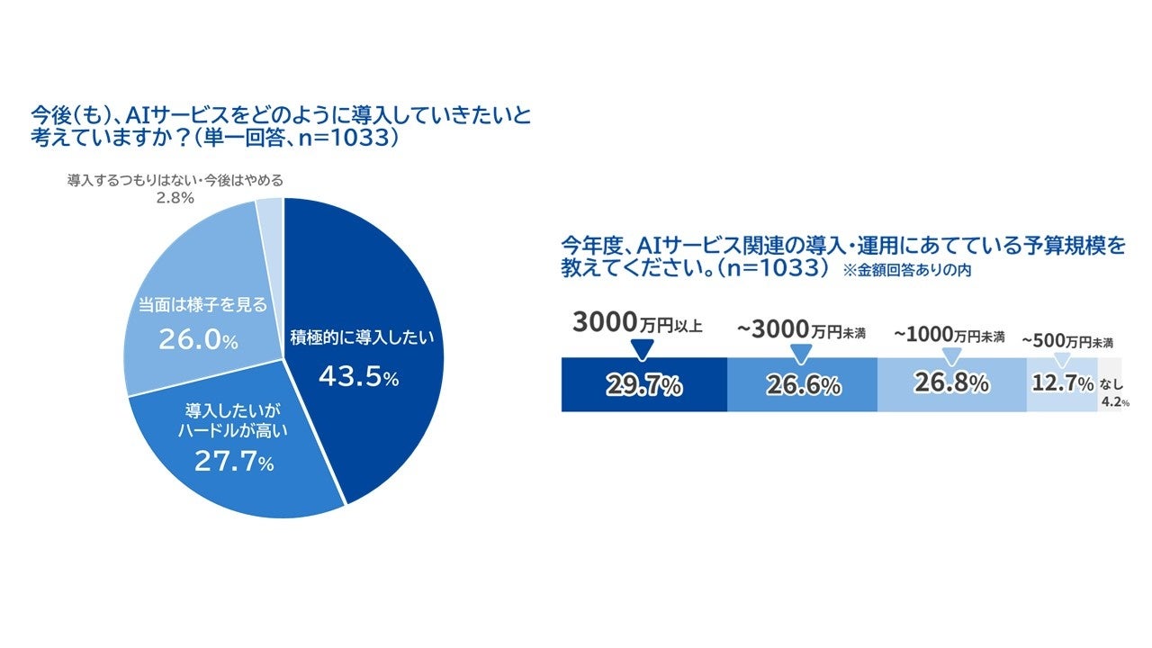 今後の積極的なAI導入意向を持つ企業は4割強。約6割がAIサービス関連の導入・運用に今年度の予算を確保し、29.7%が3,000万円以上をあてると回答。