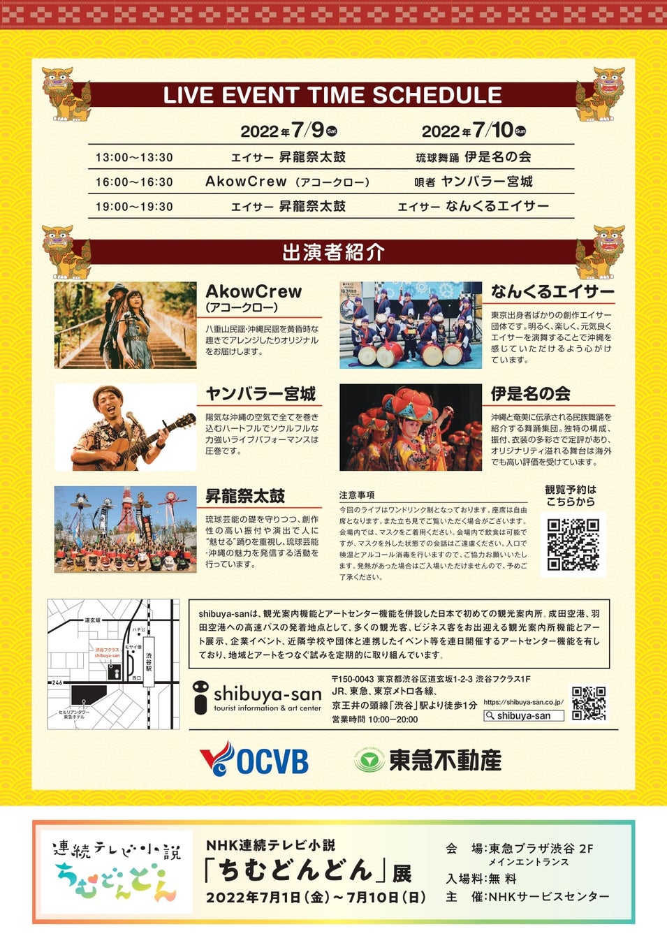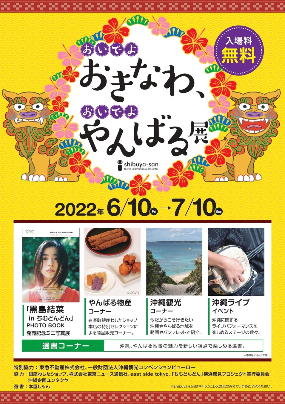 渋谷フクラス1F観光案内所兼アートセンター「shibuya-san」では、『おいでよおきなわ、おいでよやんばる展』を開催します。本イベントでは、NHK連続テレビ小説「ちむどんどん」主演として活躍する黒島結菜さんによる「黒島結菜 in ちむどんどん」PHOTO BOOK 発売記念ミニ写真展や有楽町銀座わしたショップセレクションによる「やんばる物産コーナー」、沖縄観光コンベンションビューローによる「沖縄観光コーナー」など、この夏、沖縄、やんばる地域に行きたくなる盛りだくさんのコンテンツで皆さまをお出迎えします。また7月9日(土)、10日(日)は沖縄ライブイベントを開催。5組のさまざまなアーティストによる沖縄ライブを開催します。沖縄、やんばる地域への旅へと誘う小さな旅行博覧会『おいでよおきなわ、おいでよやんばる展』皆様のご来店をお待ちしています。