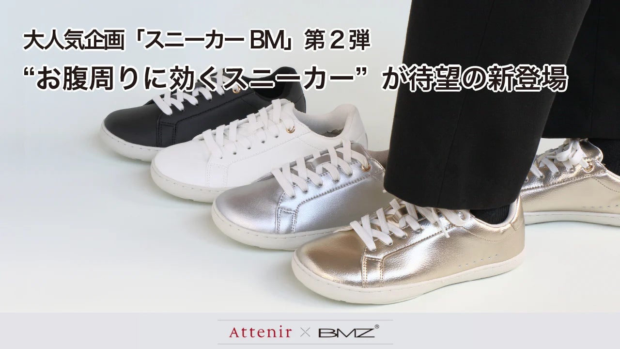 エイジングケア専門ブランド「Attenir(アテニア)」と、機能性インソールおよび機能性シューズの開発・製造を行う株式会社BMZが共同開発した新・ボディメイクスニーカー『スニーカーBM』が2024年9月18日(水)17日(火)よりアテニア様にて数量限定販売を開始いたしました。
