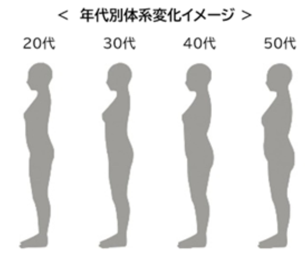右の年代別体形変化イメージのように、年齢を重ねると骨盤付近に脂肪がつきお腹まわりが出てくるように。