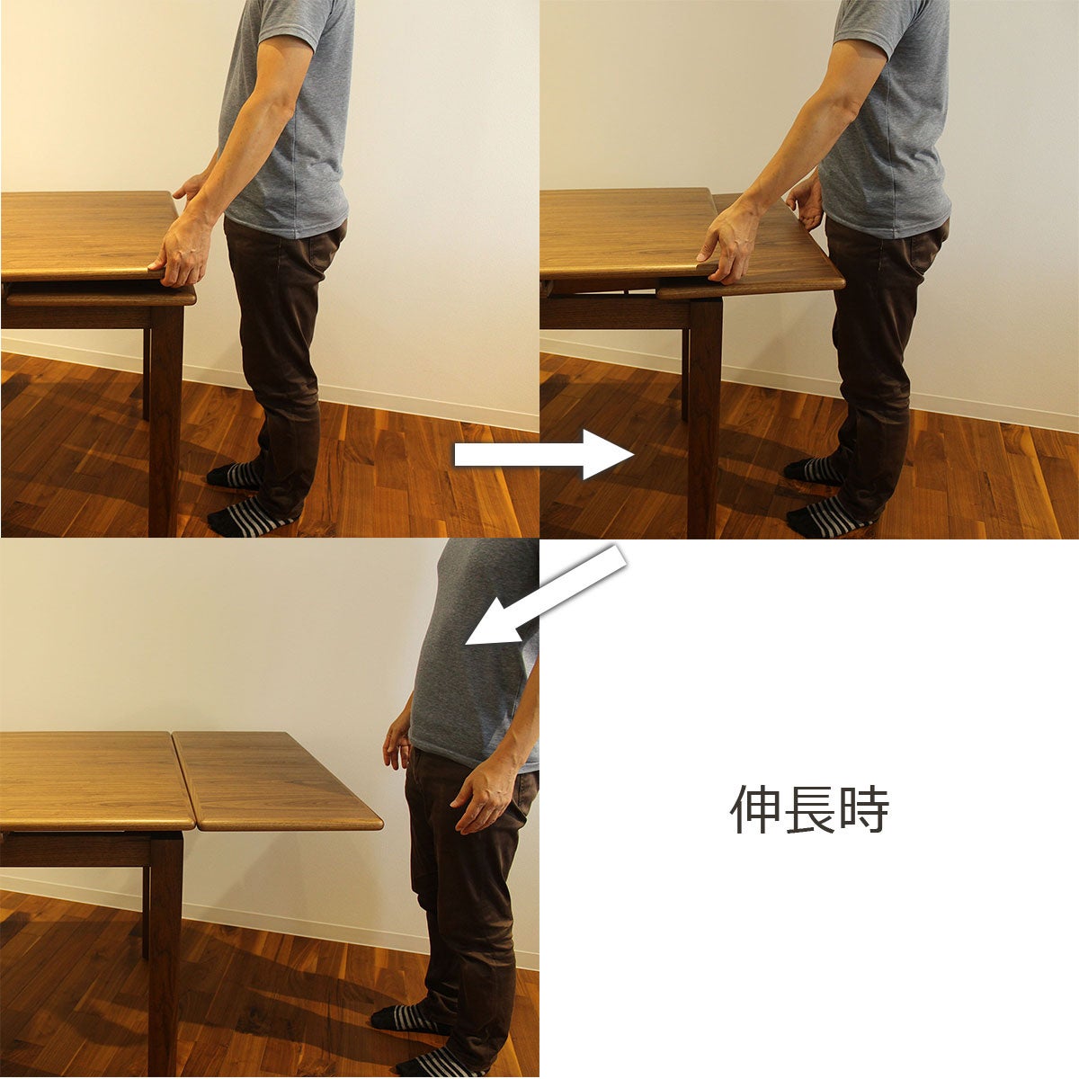 工具いらずの伸縮操作で簡単に広さ調整が可能。急な来客でもさっとおもてなしが出来ます。
