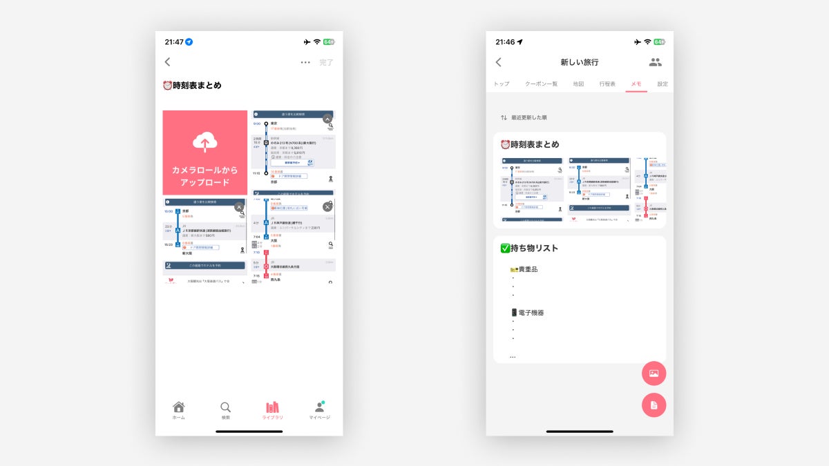 今回の対応により、旅のしおり/スポットリストの「スポット追加」にて世界中のスポットを追加できるようになりました。さらに旅のしおり内メモタブにて、画像のアップロードができるようになりホテルや航空券の予約情報・時刻表等を掲載できるようになります。