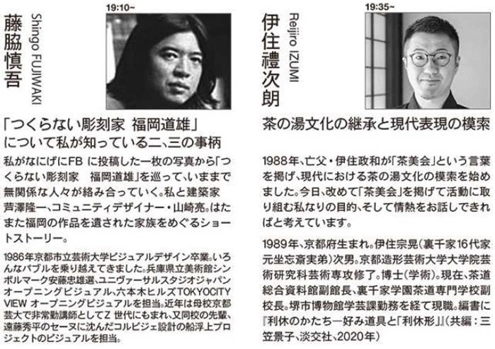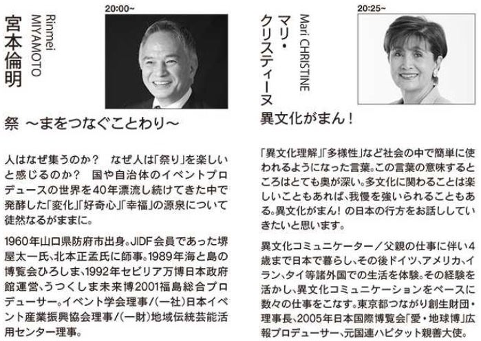 今回は、①グラフィックデザイナーの藤脇慎吾、②茶道総合資料館副館長の伊住禮次朗、③総合プロデューサーでイベント学会理事の宮本倫明、④異文化コミュニケーターのマリ・クリスティーヌの4名が登壇。ここでしか聴くことのできない、本企画限定の貴重なトークをお楽しみいただけます。