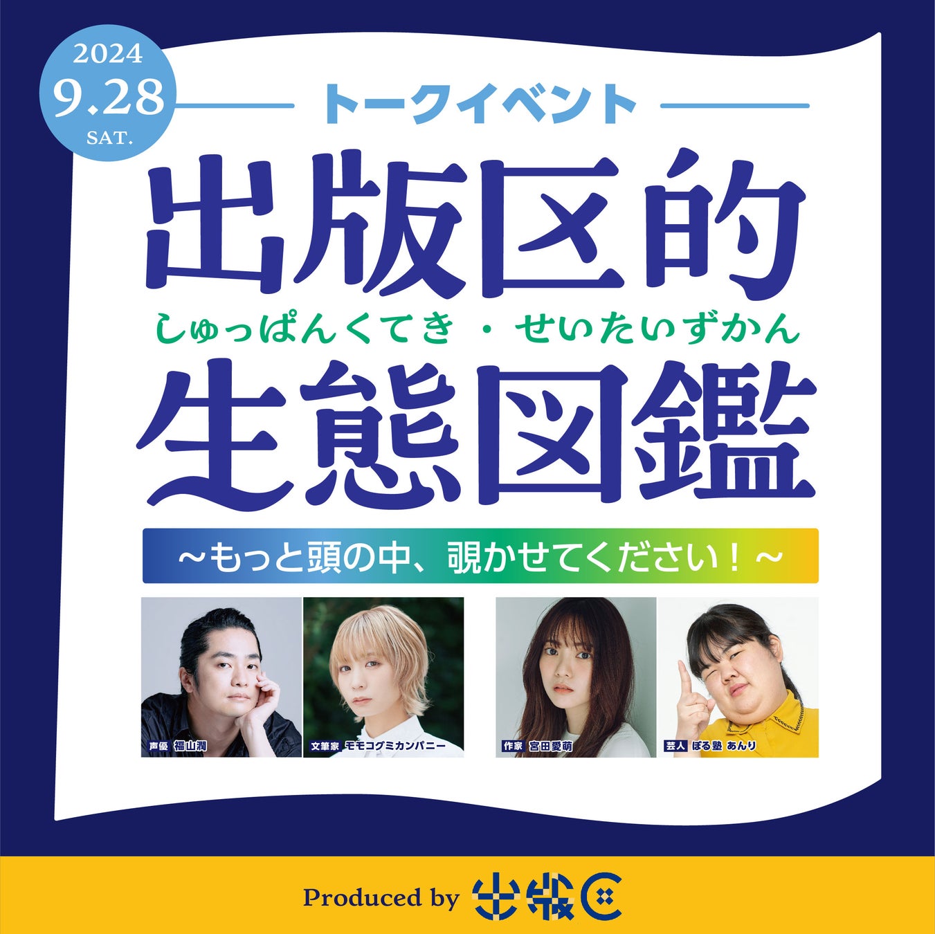 株式会社トーハン(本社:東京都新宿区、代表取締役社長:川上浩明)が運営するYouTubeチャンネル「出版区」は、2024年9月28日(土)にトークライブイベント「出版区的 生態図鑑~もっと頭の中、覗かせてください!~」を、東京都千代田区の日経ホールにて開催、オンラインにて生配信を実施します。ゲストには、第1部に声優の福山潤さんと元BiSHで文筆家のモモコグミカンパニーさん、第2部に作家の宮田愛萌さんとお笑い芸人のぼる塾 あんりさんをお迎えします。8月15日よりチケットを販売中です。