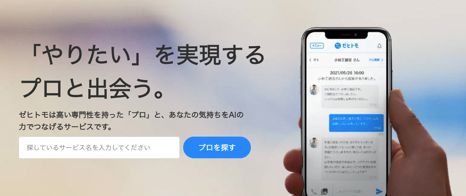 ゼヒトモは、仕事をお願いしたい依頼者と、カメラマン、ヨガ講師、リフォームや工事事業者など様々な「プロ」をつなぐプラットフォームです。依頼者には、毎日の生活をサポートするものから今まで利用しようと考えたことがないような便利なサービスまで提供し、またプロには仕事の幅や可能性を広げ、日本のローカルサービス、そして働き方を変えていきます。