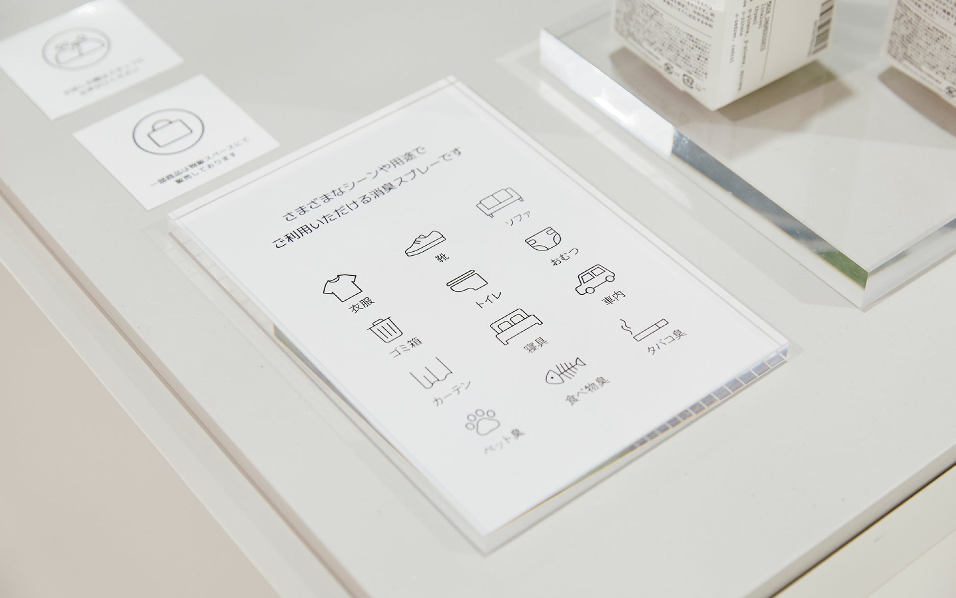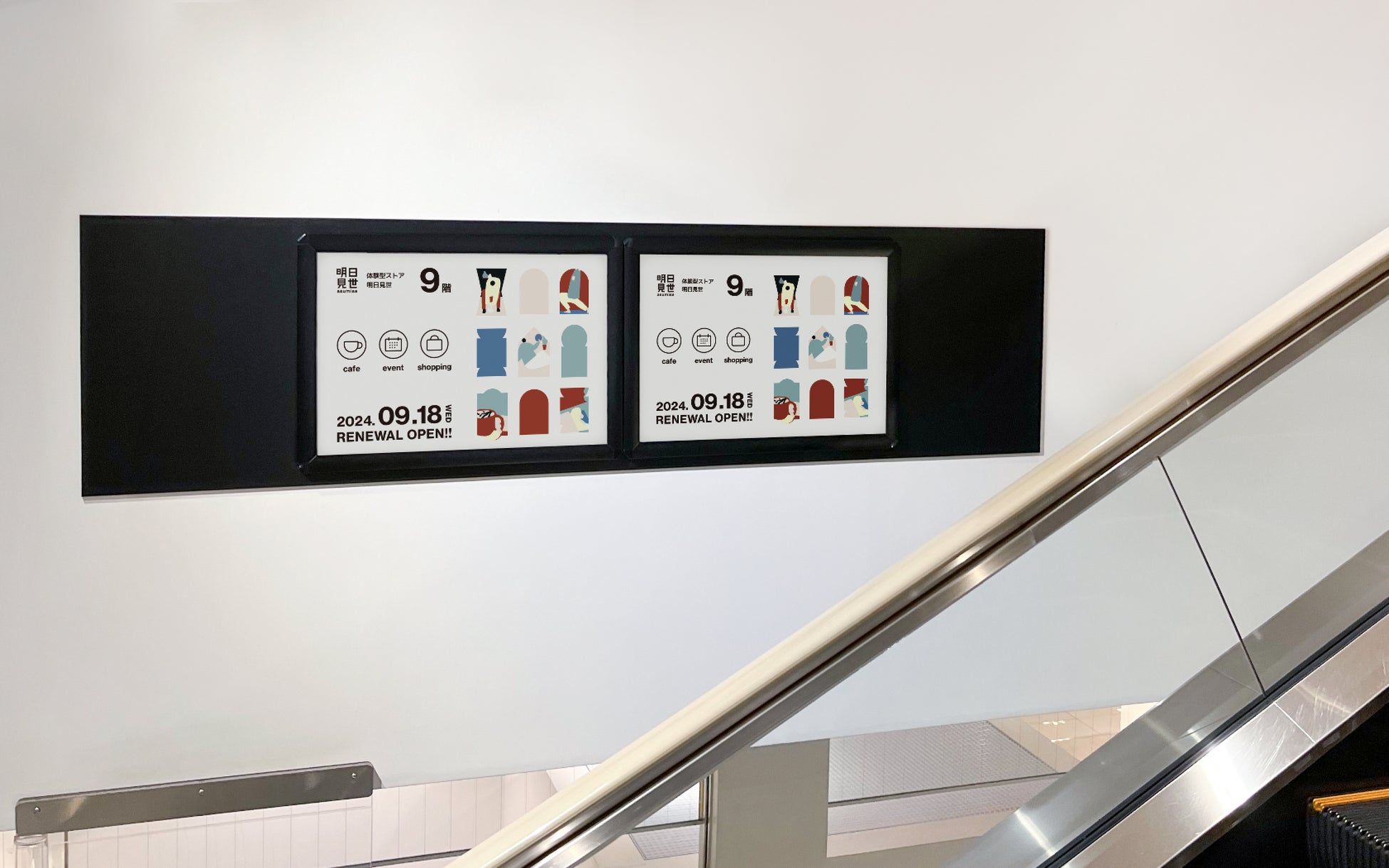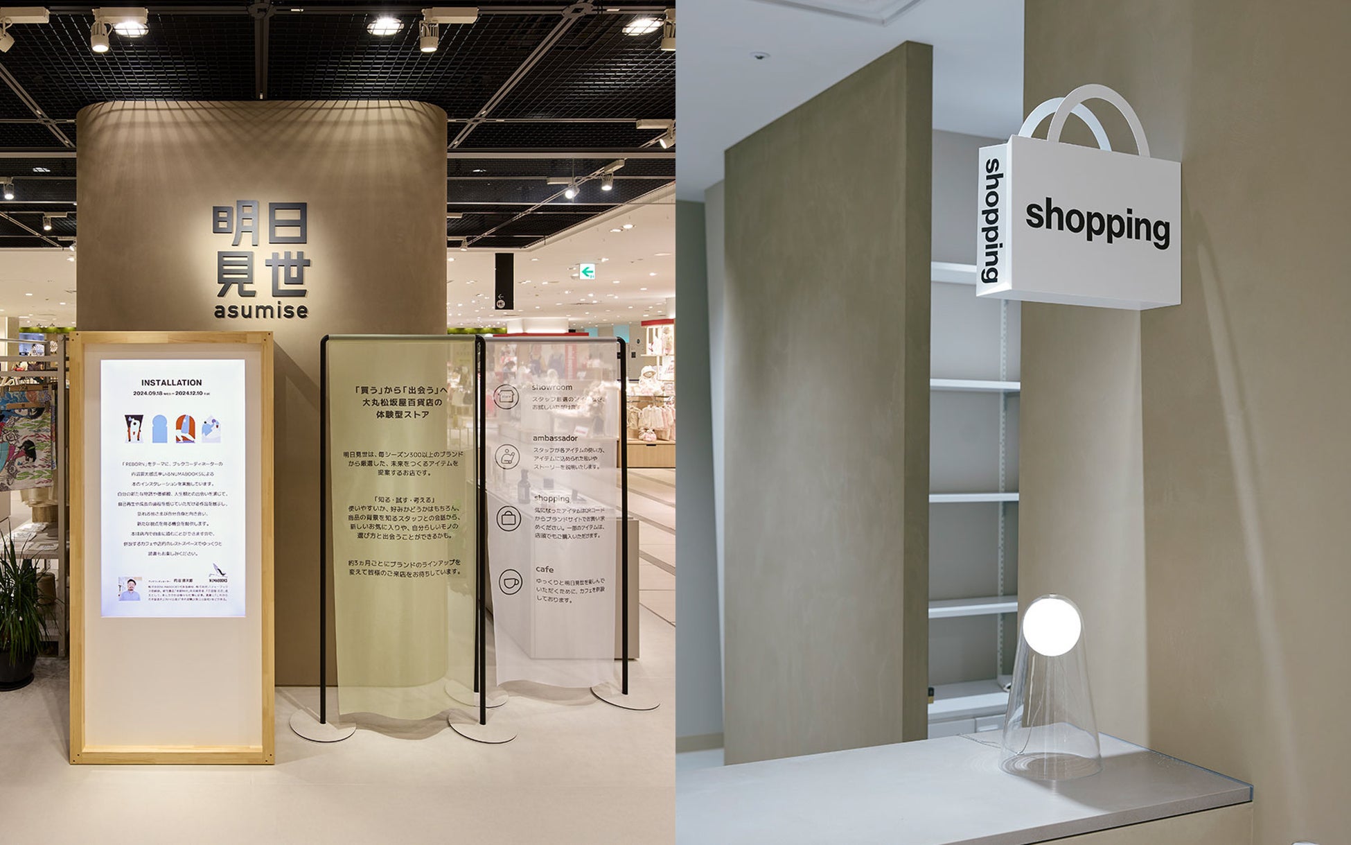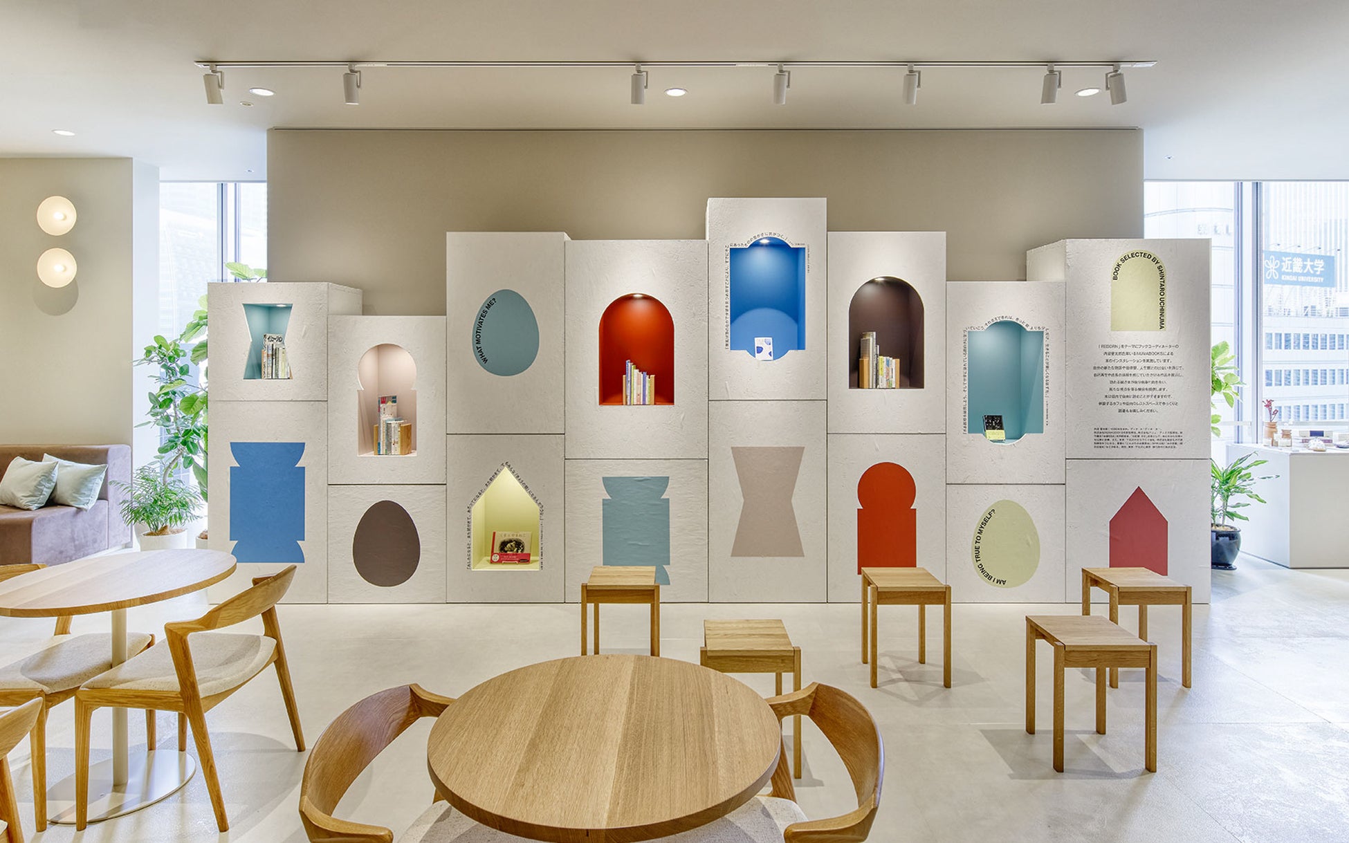 展示詳細:『REBORN』をテーマにした、本のインスタレーション。訪れた人が本を手に取り、新しい出会いの場をつくります。『扉』や『窓』のボックスを本棚に見立て、選書された本のなかで『REBORN』を感じさせる一文を引用し、タイトル/著者と共にあしらったデザインを施しています。店内と通路側の2箇所に設置されており、ベビースペースに近い通路側には子ども向けの本を、カフェに隣接する店内には、『明日見世』の世界観を感じながらゆったりとお読みいただけるよう配慮をしています。選書は、内沼晋太郎氏率いるNUMABOOKSに依頼し、ノングリッドが企画・制作しました。
