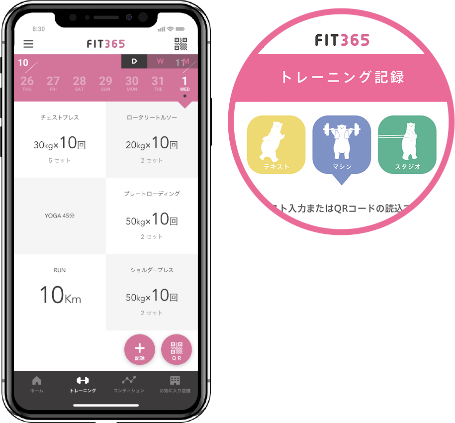 さらに、専用アプリ「FIT365app」で館内の入退場機能や、体重や体脂肪率の管理機能、お気に入り登録した店舗の混雑状況もアプリで確認できます。トレーニング記録も残すことができるので、日々のフィットネスライフをアプリでまとめて管理が可能です。