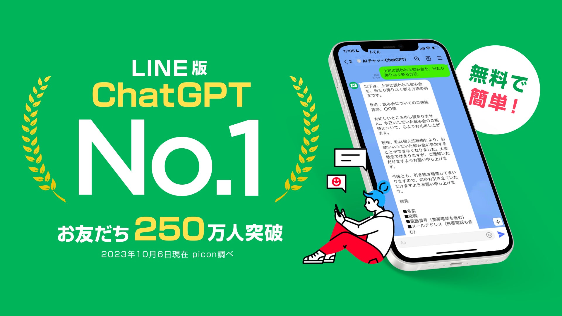 日本人が使い慣れているLINEにて、ChatGPTを使えるサービスとして「AIチャットくん」をリリースいたしました。リリース後、登録者数は約1ヶ月後には100万人、2023年6月には200万人、そして10月6日に250万人を突破いたしました。また、アプリ版のダウンロード数も80万を突破し、累計330万人以上の方にご利用いただいております。