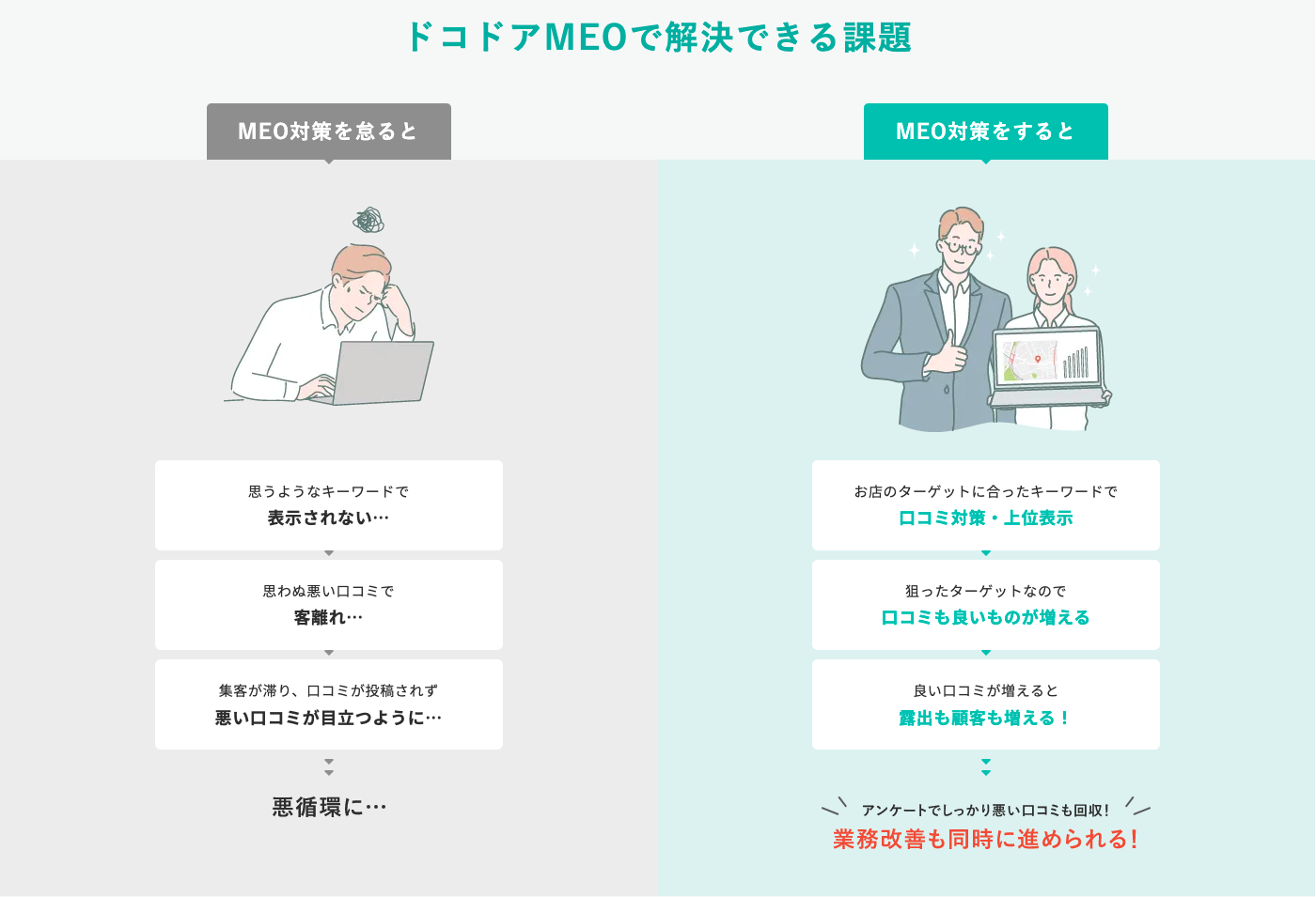 ■ドコドアMEOはターゲットに合わせたキーワード設定でGoogleマップでの上位表示から口コミ対策、業務改善まで一括管理が可能。