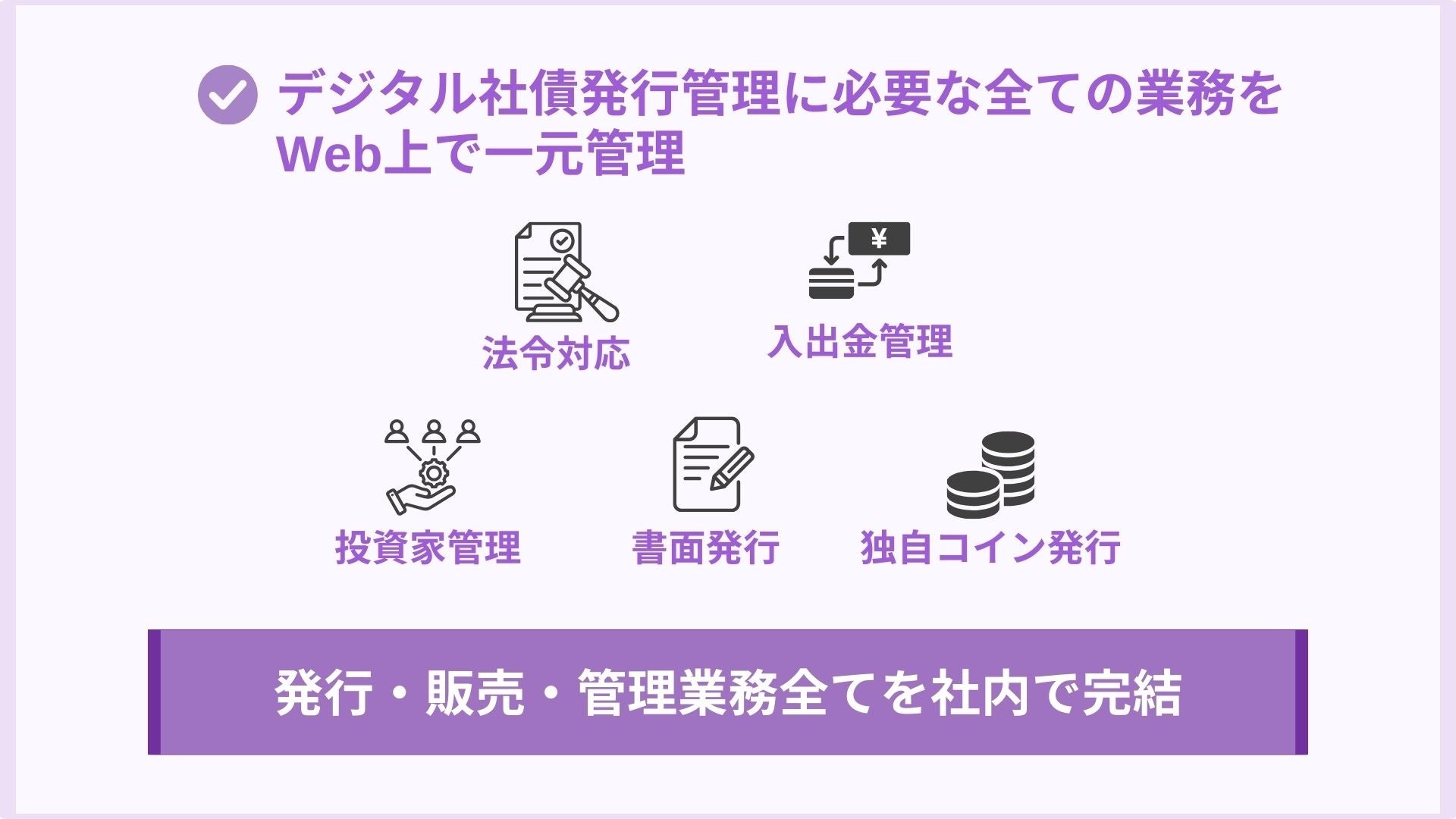 「OwnerShip」社債版は、投資家募集や出資金管理、分配金計算から法定帳票の作成までデジタル社債の発行管理に必要な全ての業務をWeb上で一元管理できるよう設計されております。
