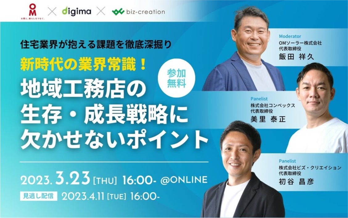 住宅業界は、コロナショックやウッドショック、資材ショックなど多くの変化に見舞われています。そのような厳しい環境の中、いかにして地域工務店は生き延び、成長していけば良いのか。「集客難」「お客様の検討期間の長期化」「DX(デジタル活用)」をテーマとして、これから成長していく地域工務店には何が必要なのかを、数多くの地域工務店を支援し、住宅業界を知り尽くしている3社の社長がそれぞれの視点より対談します。工務店経営者、工務店集客担当者の方は、無料でオンライン参加することができます。