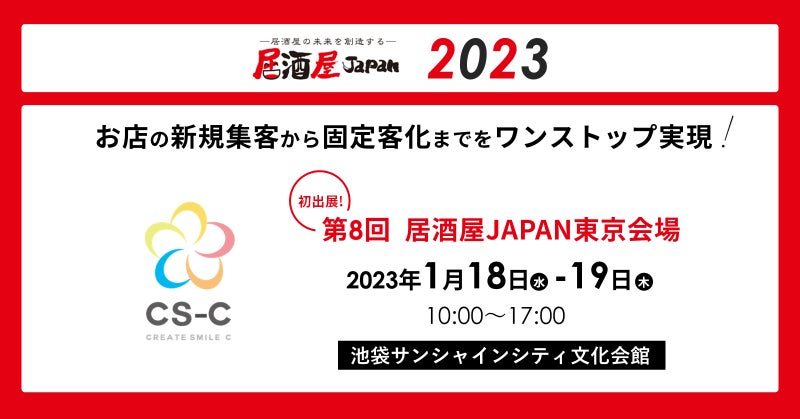 ローカルビジネスDX事業を展開し、SaaS型統合マーケティングツール「C-mo」を提供する株式会社CS-C(本社:東京都港区、代表取締役:椙原 健)は、2023年1月18日(水)19日(木)、池袋サンシャインシティ文化会館にて開催される飲食業界・外食業界をターゲットにした専門展示会「居酒屋JAPAN2023」に出展します。